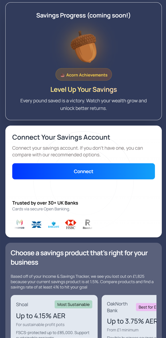 - Connect your bank – secure Open Banking link in under 60 seconds.
